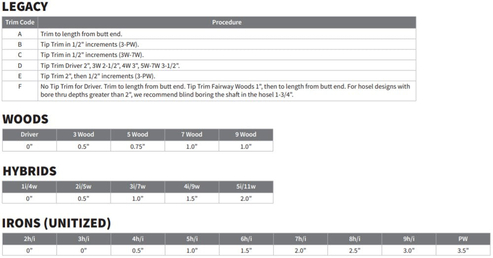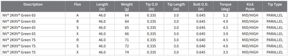 | Shaft Name | Flex | Length (in) | Weight (g) | Tip O.D. (in) | Tip Length (in) | Butt O.D. (in) | Torque (degrees) | Kick Pt. |